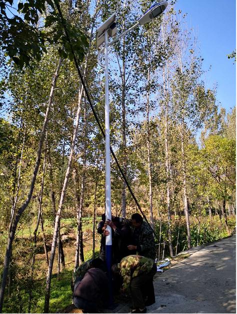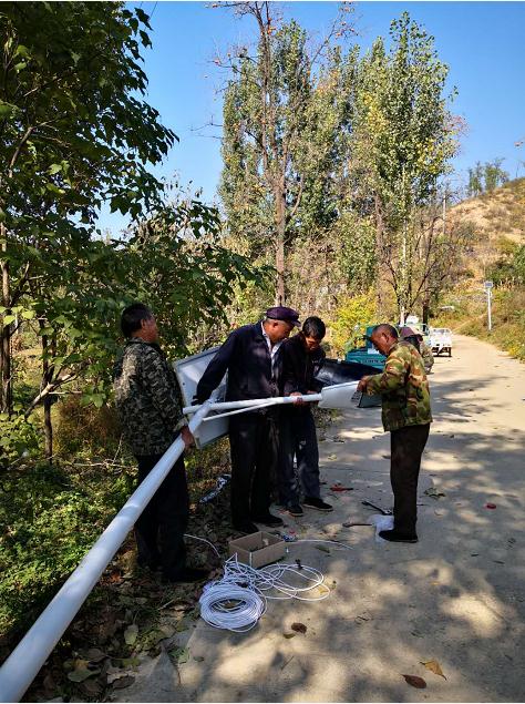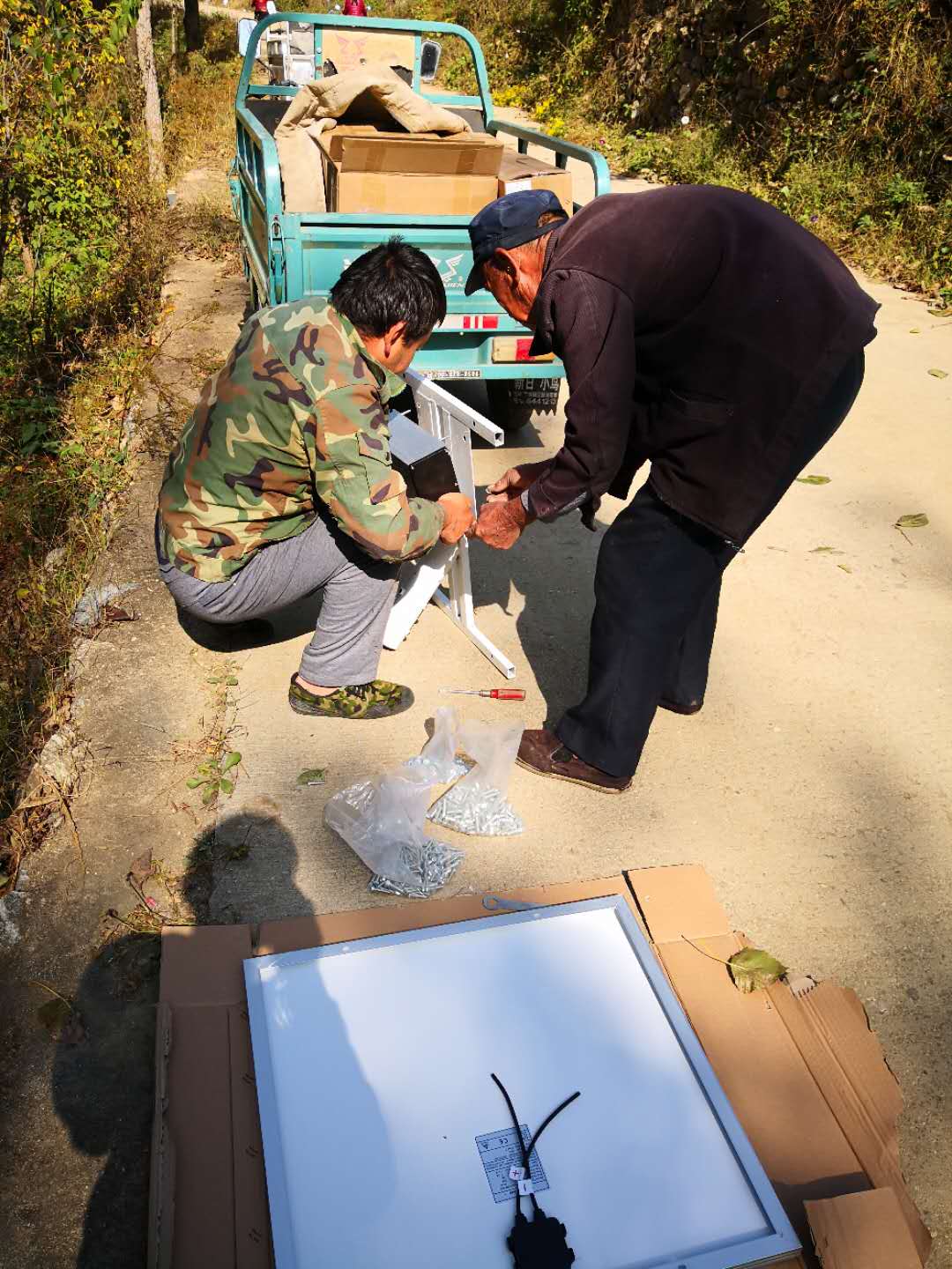 上圖為兩名村民正在組裝太陽能鋰電池和太陽能光板